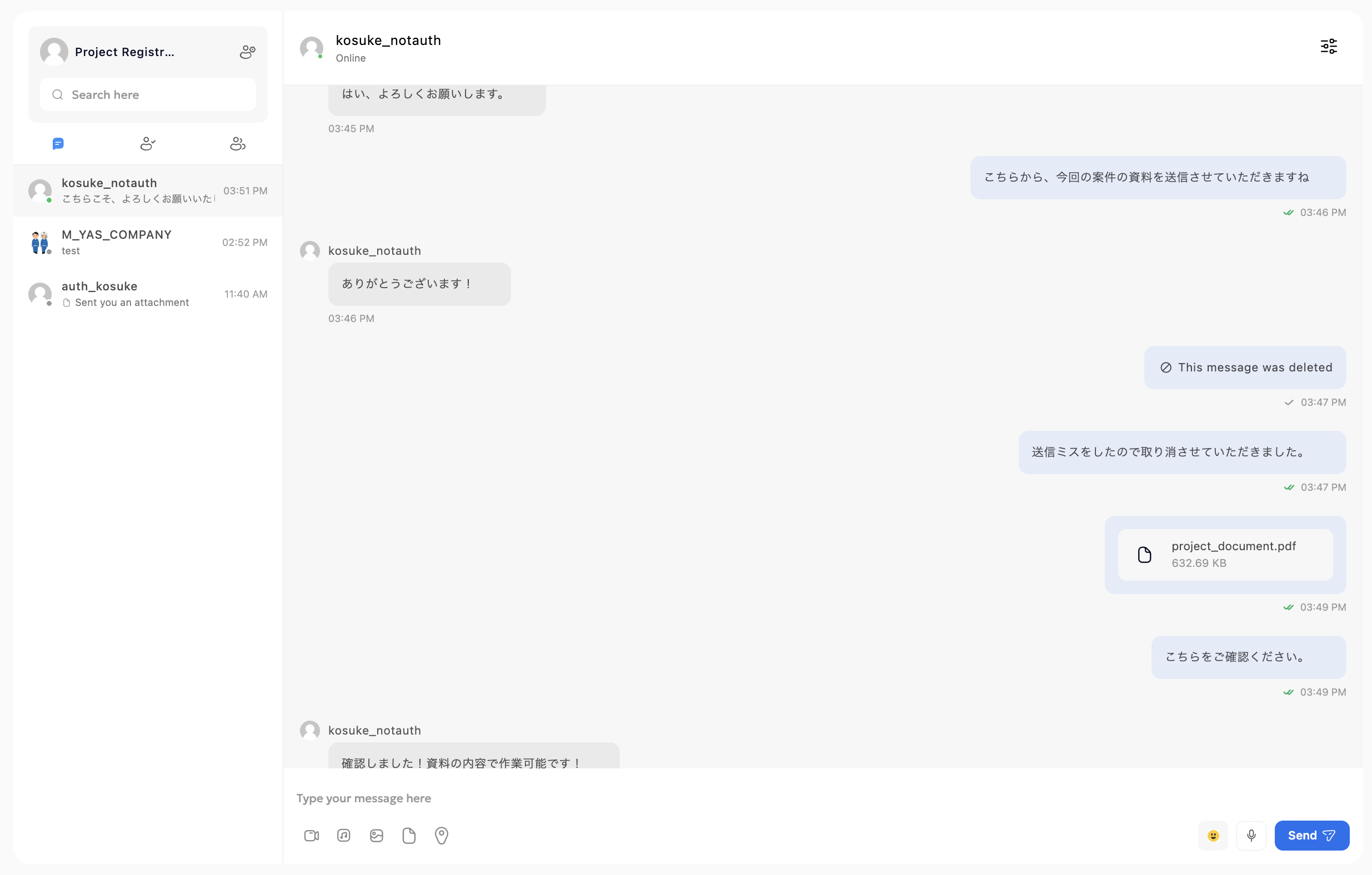 中央のチャットエリアでは送受信メッセージが時系列で並び、既読・未読ステータスが表示されます。返信欄からテキストを入力し、送信ボタンで送付します。