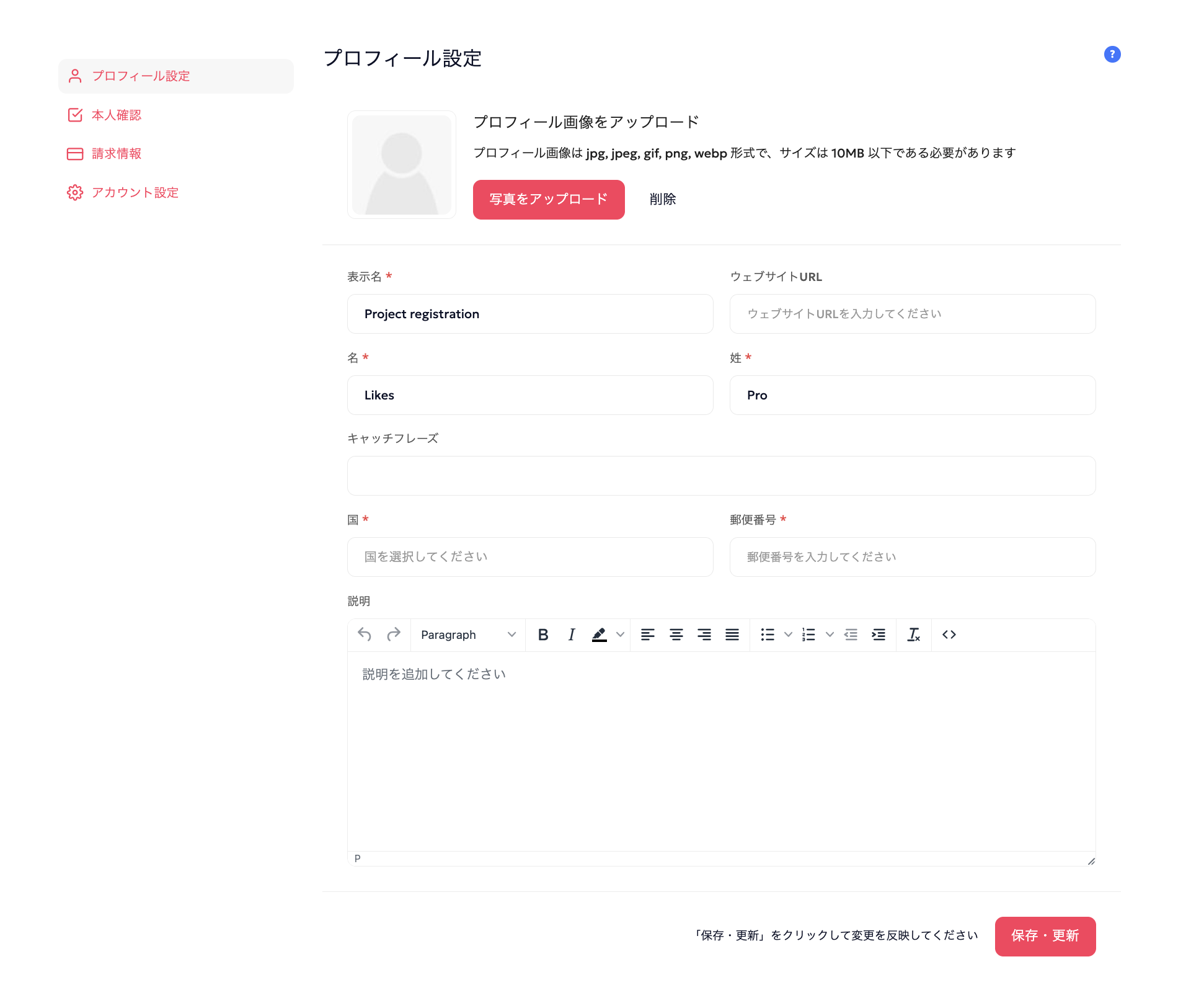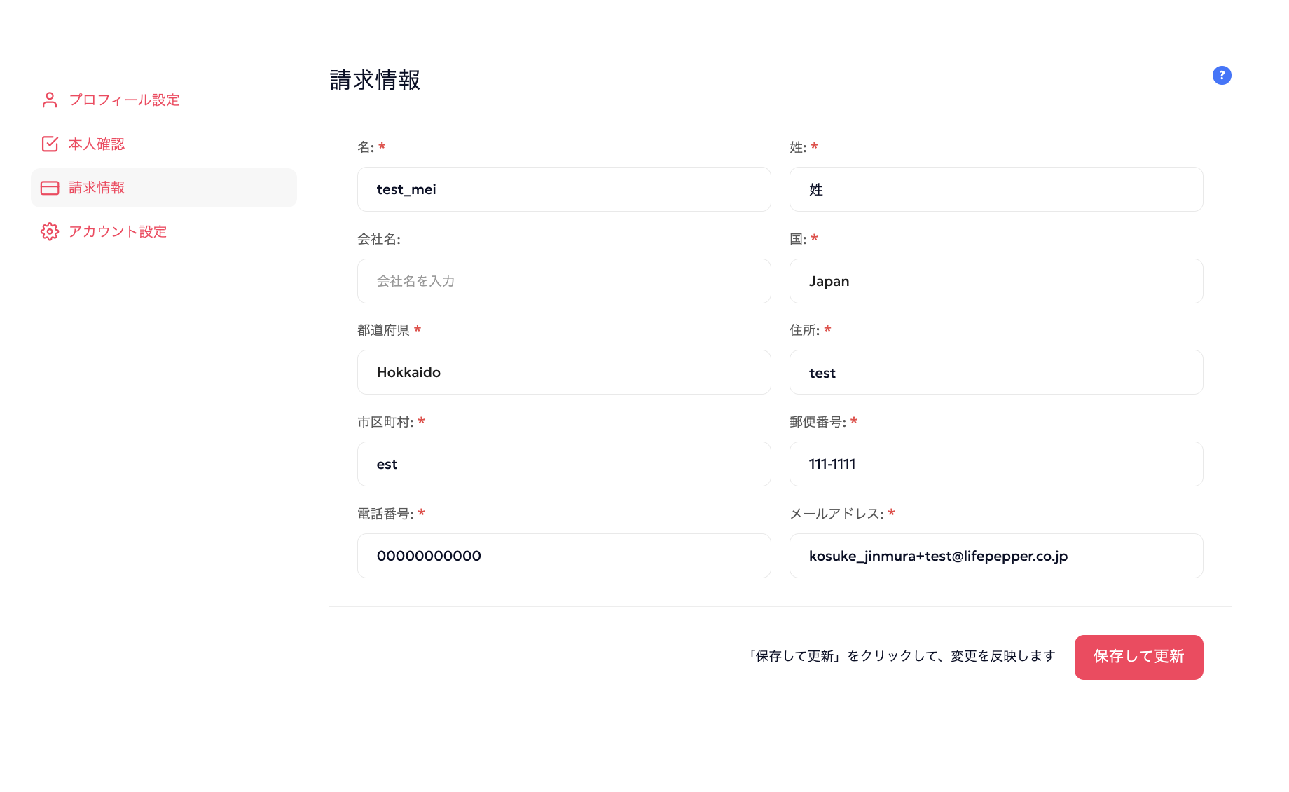 設定では、左側に「プロフィール設定」「本人確認」「請求情報」「アカウント設定」のタブが表示されます。