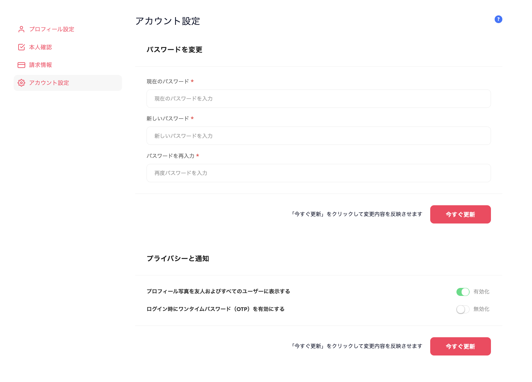 現在のパスワードと新しいパスワードを入力して更新し、アカウントの安全性を維持します。プロフィール画像の公開範囲や二段階認証(OTP)の有効化、アカウント一時停止などのプライバシー設定も同じ画面で切り替えられるため、利用状況に合わせて適宜調整してください。