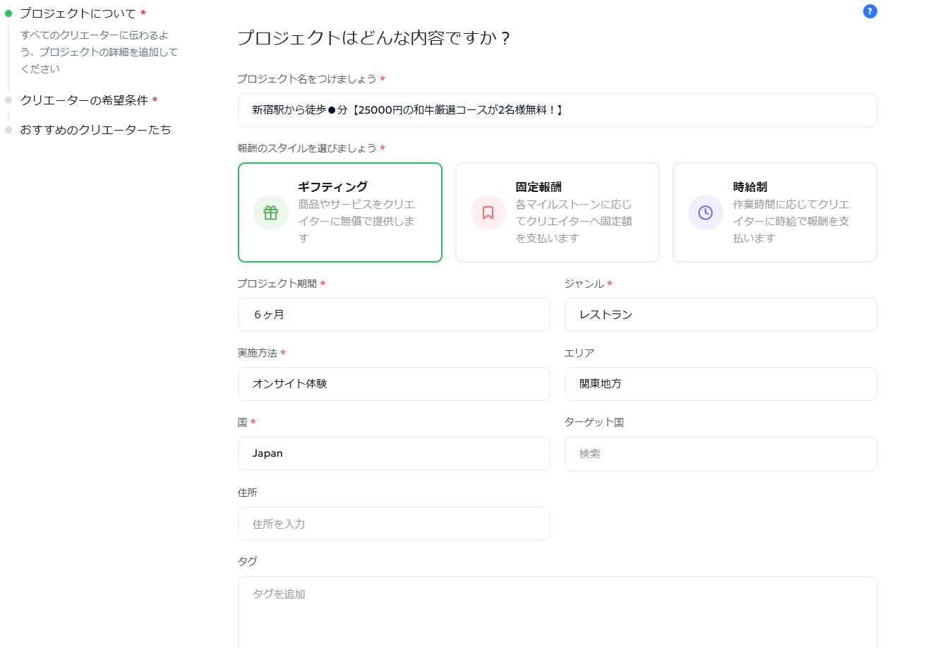 | エリア | 実店舗や施設などクリエイターが体験するエリアを選択します |