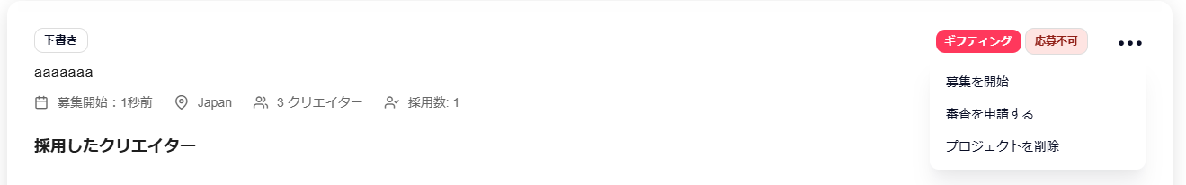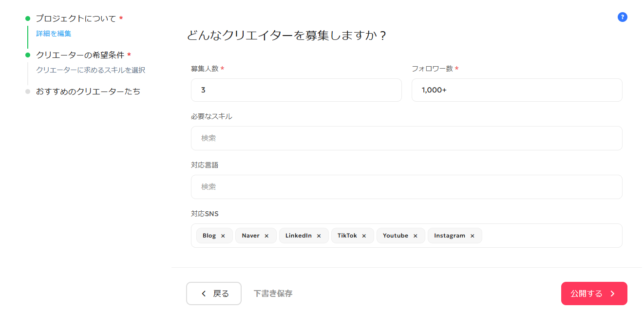 募集人数 募集人数を選択します フォロワー数 希望のフォロワー数を選択します ※必ずしもフォロワー数=エンゲージメント率ではないため、幅広く採用をおすすめしています 対応言語 希望がある場合は選択します 対応SNS プロジェクトの投稿を希望するSNSを選択します ※なるべく全てのSNSを選択いただくことが応募数UPに繋がります 全ての記載が完了しましたら【公開する】へ進む