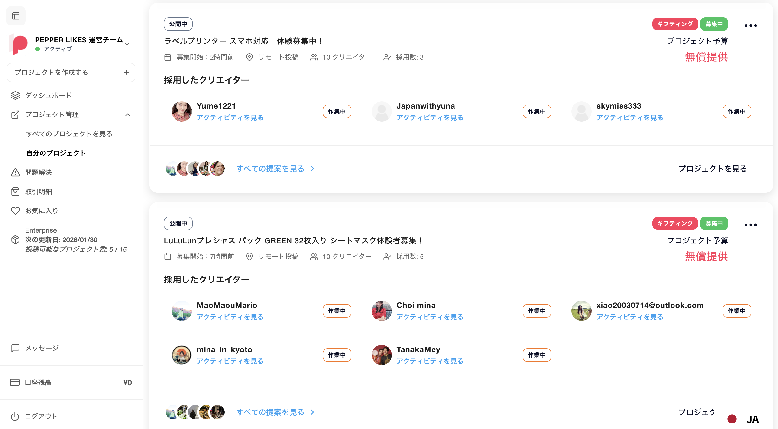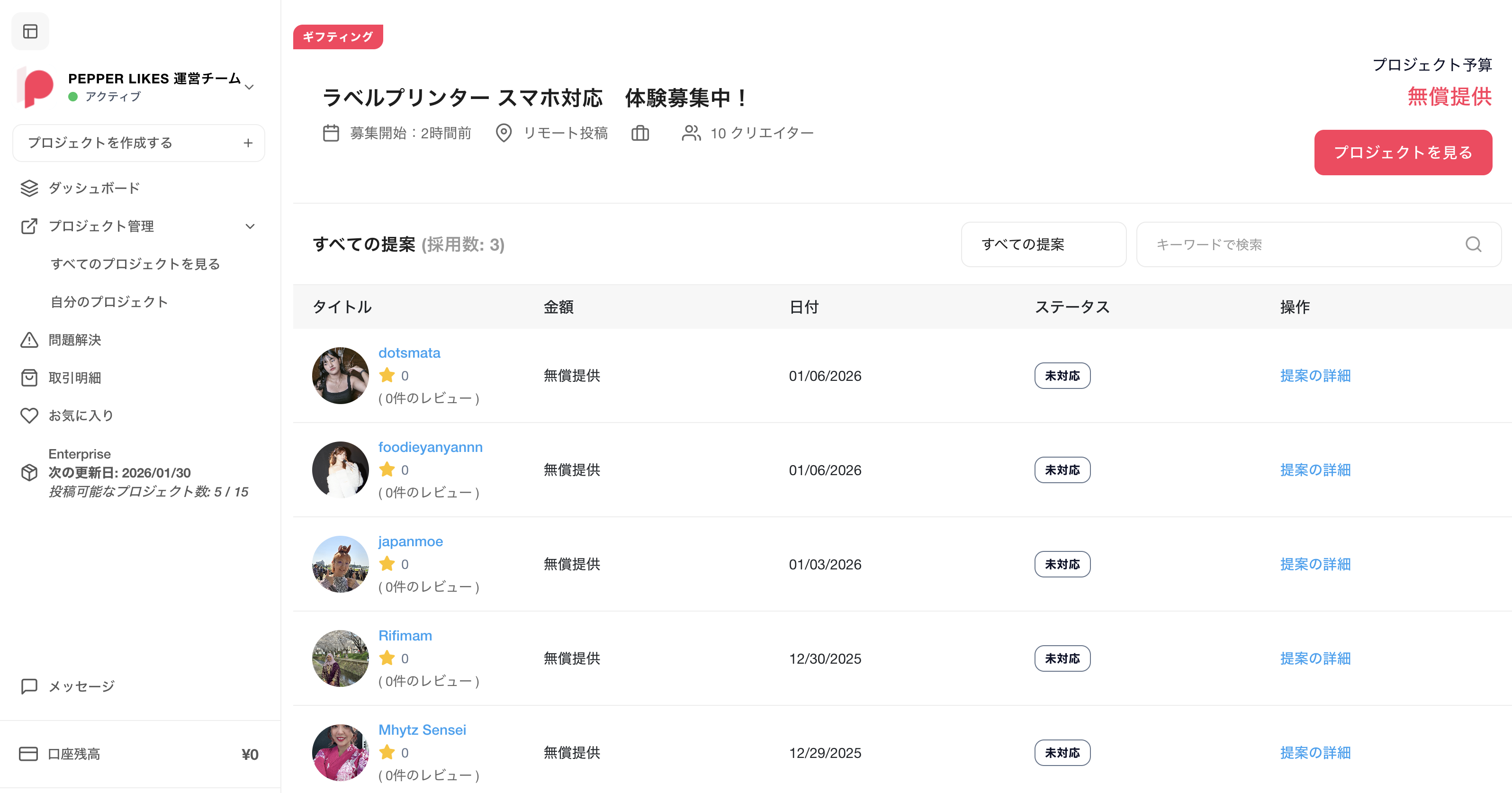 「すべての提案を見る」をクリックすることで、該当するプロジェクトに応募したインフルエンサーの一覧が確認できます。