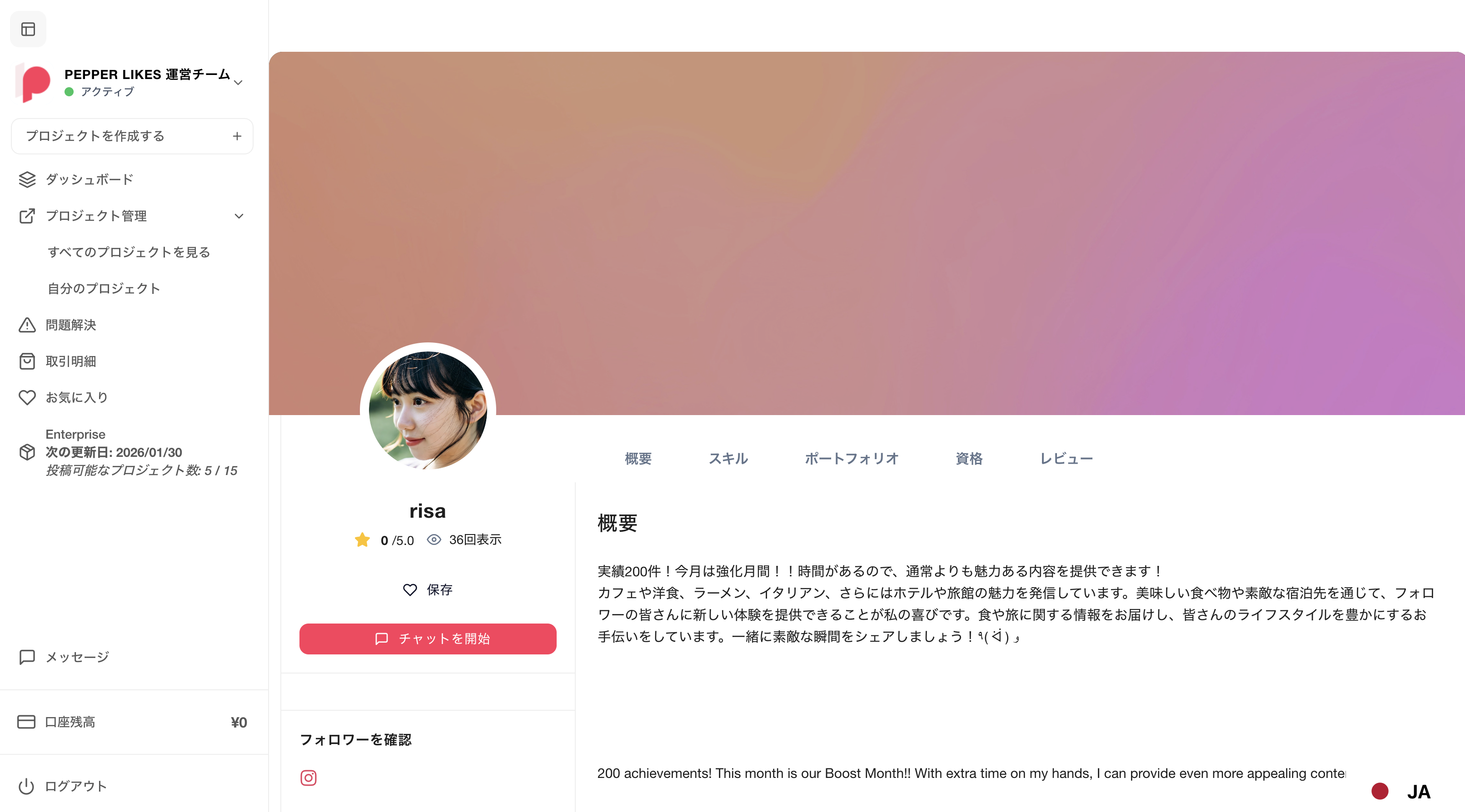 採用を決定する前にインフルエンサーとのメッセージのやり取りを行うことも可能です。「チャットを開始」ボタンからチャットを開始することが可能です。