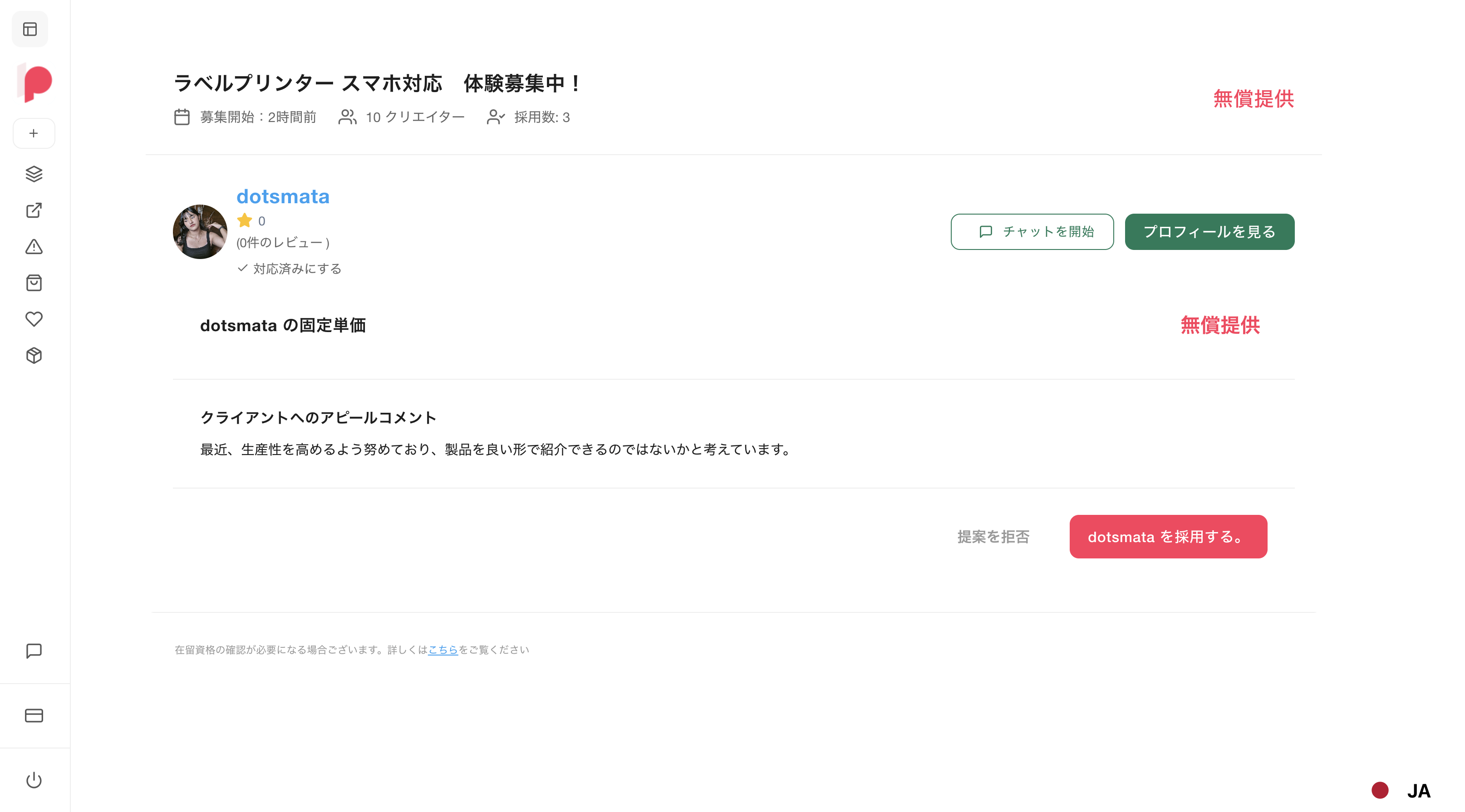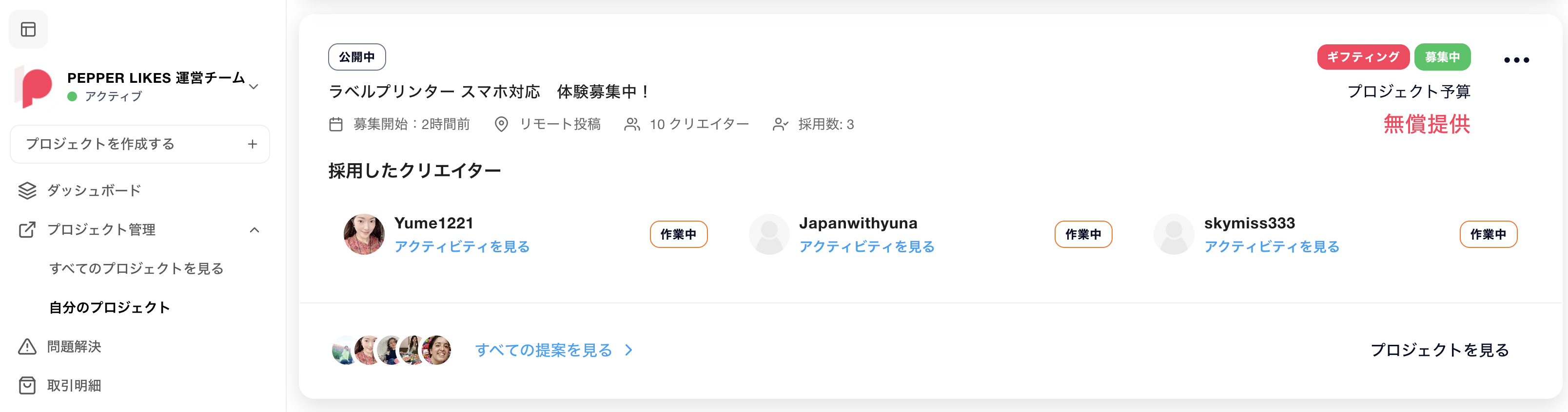 採用したクリエイターは募集一覧でも「採用したクリエイター」として表示されます。