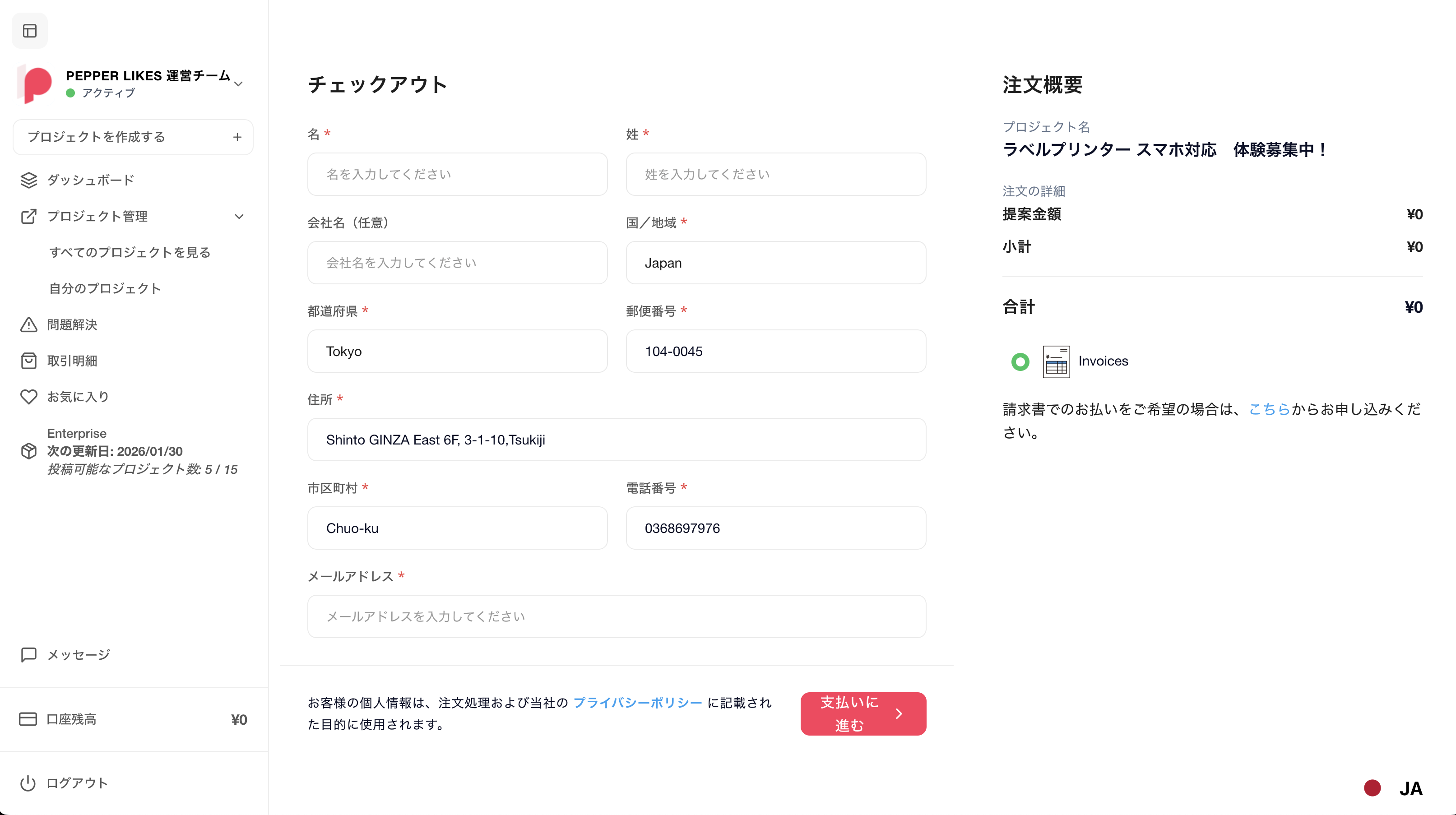 (請求先情報はあらかじめプロフィールより設定しておくと、都度入力する手間を省略することが可能です)